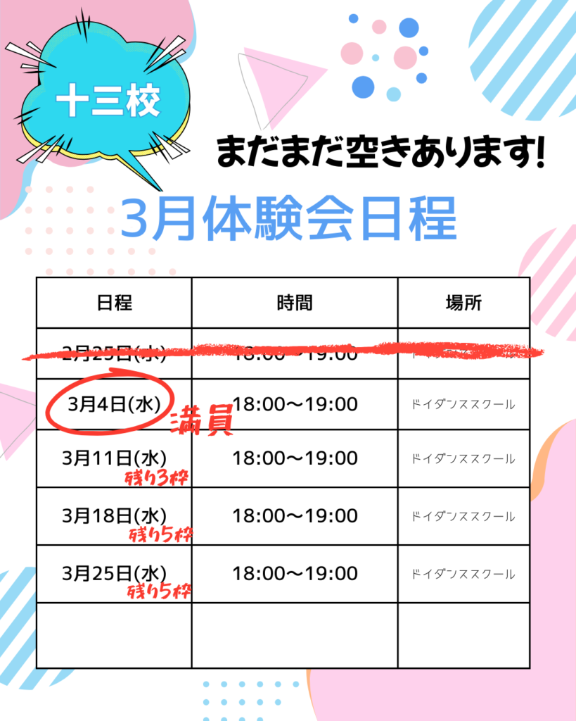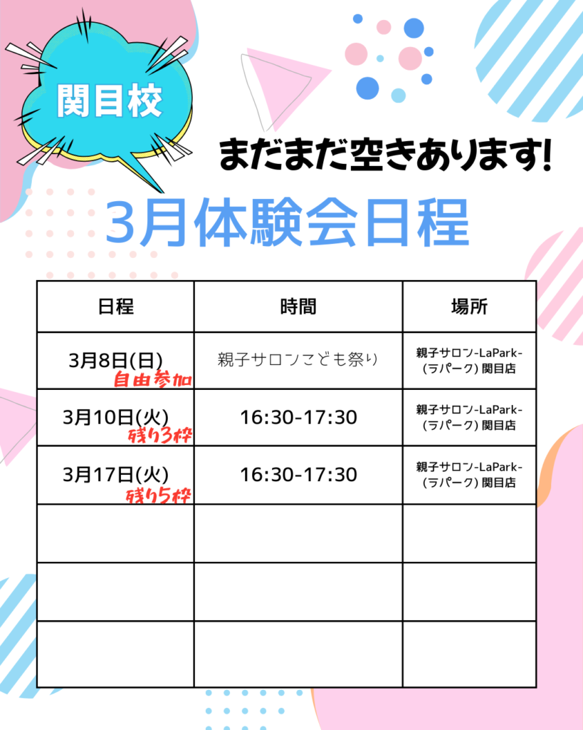 定員になり次第、3月の体験受付を終了する場合がありますのでご了承ください。